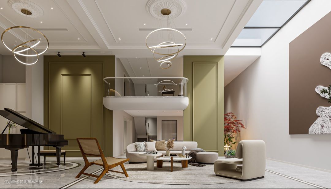 在休闲区域,我们注重舒适度和多功能性。螺旋金属线条吊灯和美式元素石膏吊顶营造出一个独特的灯光氛围。下沉式挑空区域的牛油果绿与白色墙面形成对比,给人一种活力四溢的感觉。弧形象牙白布艺沙发、多元化混搭木艺休闲座椅以及极简圆弧造型的单人沙发,让您可以在这里放松身心。下沉式玻璃采光层为整个休闲区域带来充足的自然光线。