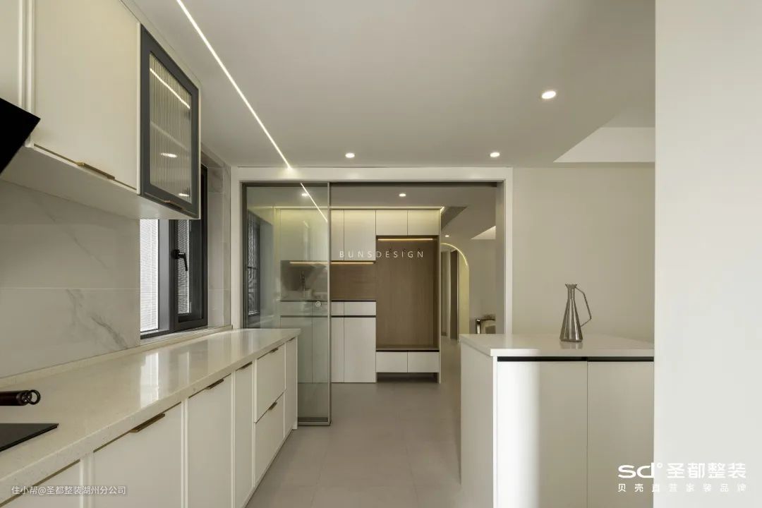 将厨房与餐厅相连通,规划出双动线设计,既能提高空间通透感,又能提高生活效率。