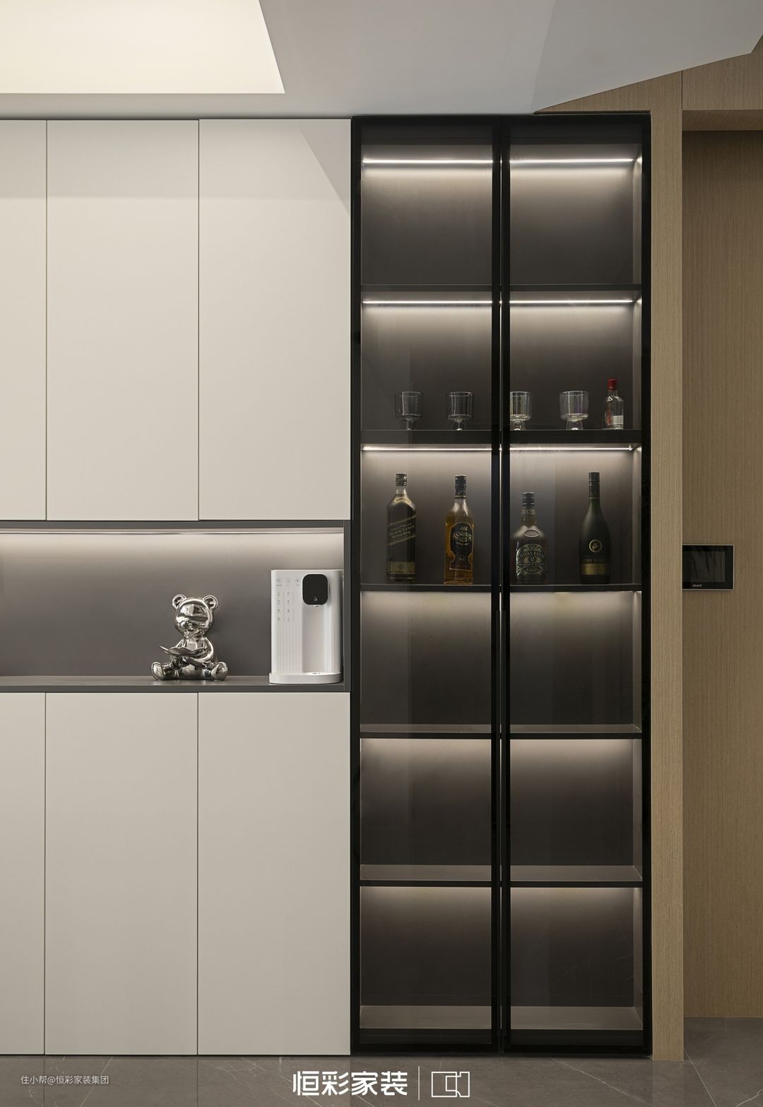 屋主喜好藏酒,做了一面开放式酒柜,半透明深色玻璃柜门和灯带组合,增加了藏酒的氛围感。