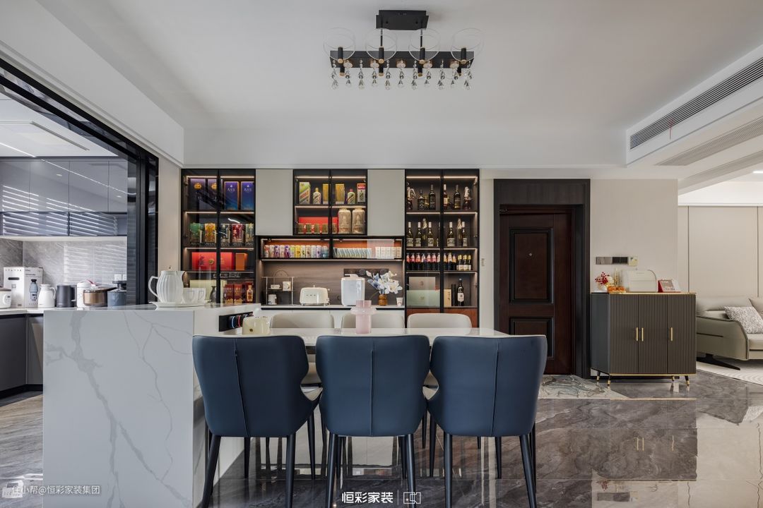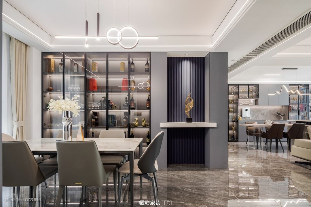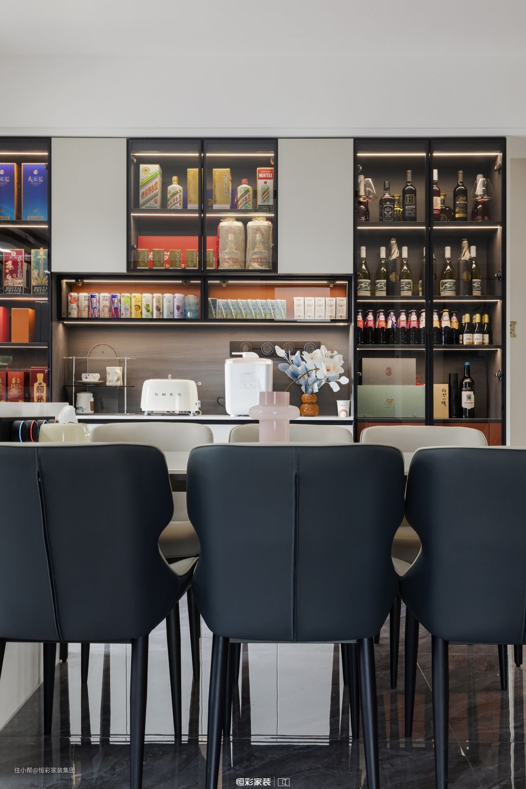 餐厅餐边柜兼具酒柜功能,玻璃柜门内部精心设计的灯带,巧妙地烘托着琳琅满目的酒瓶。