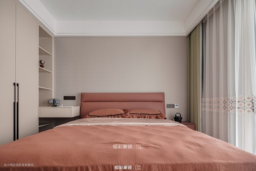 卧室定制整排收纳柜,搭配米色纹理墙布,打造温馨舒适的卧室空间。