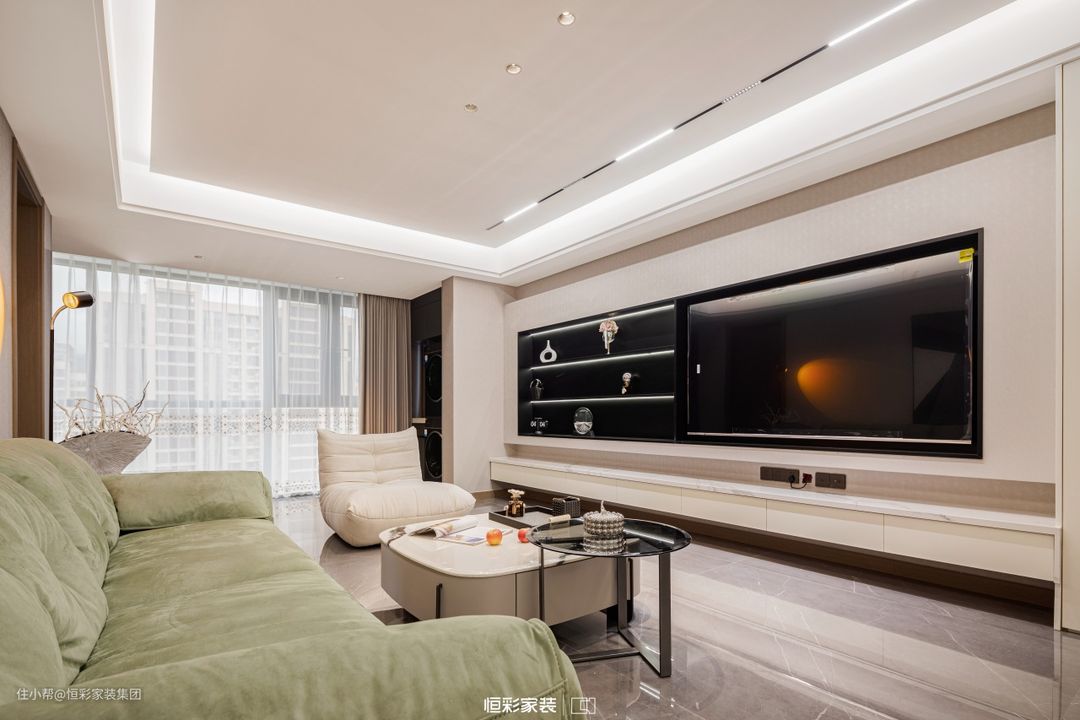 设计师拓宽背景墙,定制电视背景整体柜,视觉上延伸空间感增加收纳。