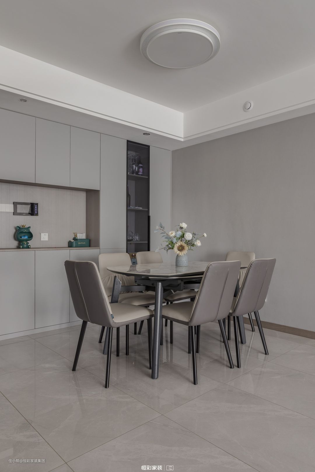 餐厅保持原有格局不变,靠墙定制整面餐边收纳柜+观赏柜。