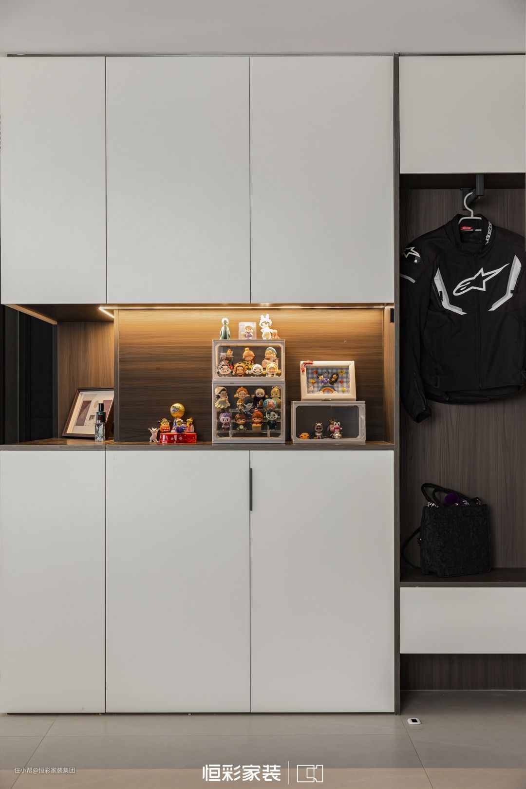 女屋主比较喜欢整理和收纳,玄关柜是刚需,靠墙定制了玄关和收纳一体的整体柜,一举解决两个功能区的收纳需求,视觉上整齐划一。