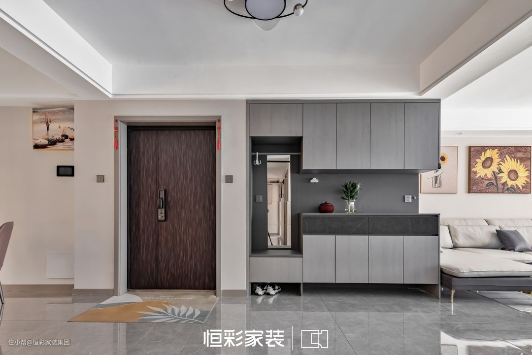 原户型无玄关,入户门厅走廊充分利用起来,定制玄关柜包含换鞋凳+挂衣区,功能满分。