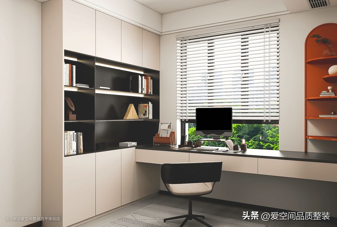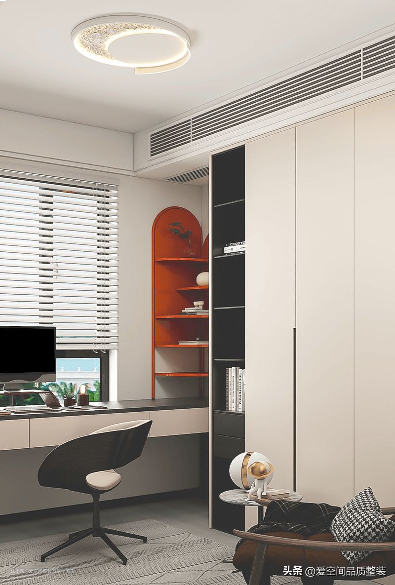书房的另一侧点缀了橙色书架,造型独特有个性,但与整体风格搭配并不违和。通顶柜也留出了开放格,这里暂时放的东西不多,为后续收纳留出了空间。