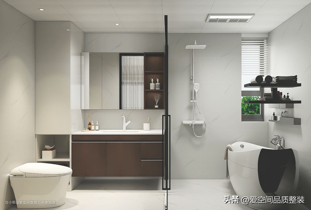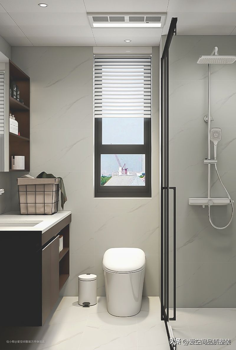 次卫生间通过玻璃淋浴屏,在内部实现了干湿分离,洗澡不会喷溅水到马桶,也更好清洁地面。浴室柜和镜柜都为深棕色,与主卧一样,镜柜留出了开放空间,浴室柜下方也做了开放隔,便于放换洗衣物。