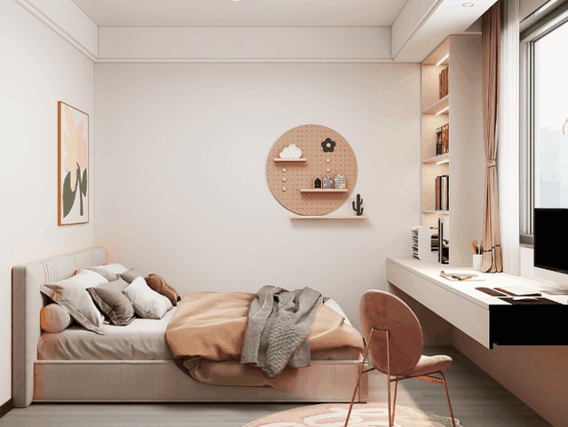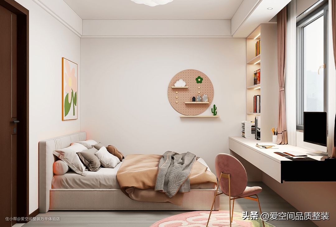 为了给女儿房增添温馨可爱感,床头挂粉色花朵形挂画,粉色圆形洞洞板和多层隔板设计,丰富了空洞的墙面,但是并不累赘。粉色窗帘和座椅,一高一低的搭配,也更有层次感。