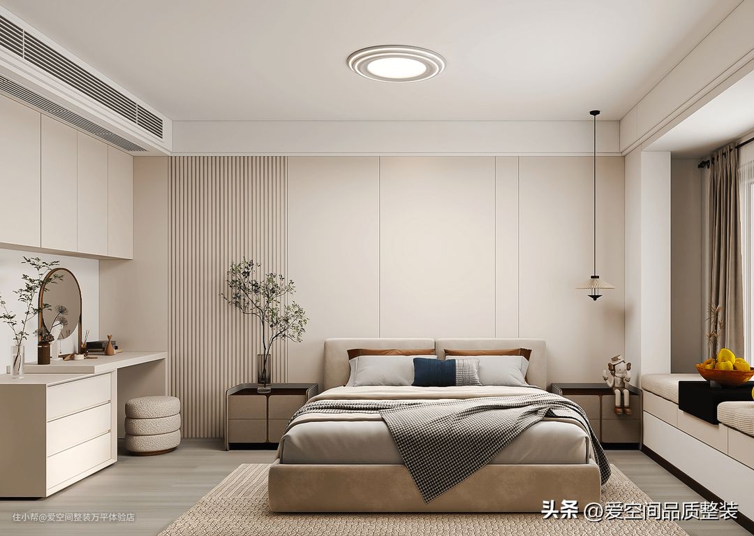 主卧为女业主做了高低款的梳妆台,还做了与背景墙同色的吊柜,不浪费可以收纳的墙面,丰富了室内储物空间。另一侧的飘窗做了软包榻榻米,阳光好的时候可以半躺着在这里看书。双人床居中,左右两侧的床头柜为多层抽屉款,方便使用。