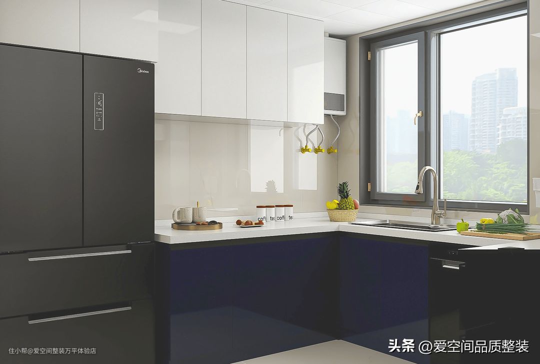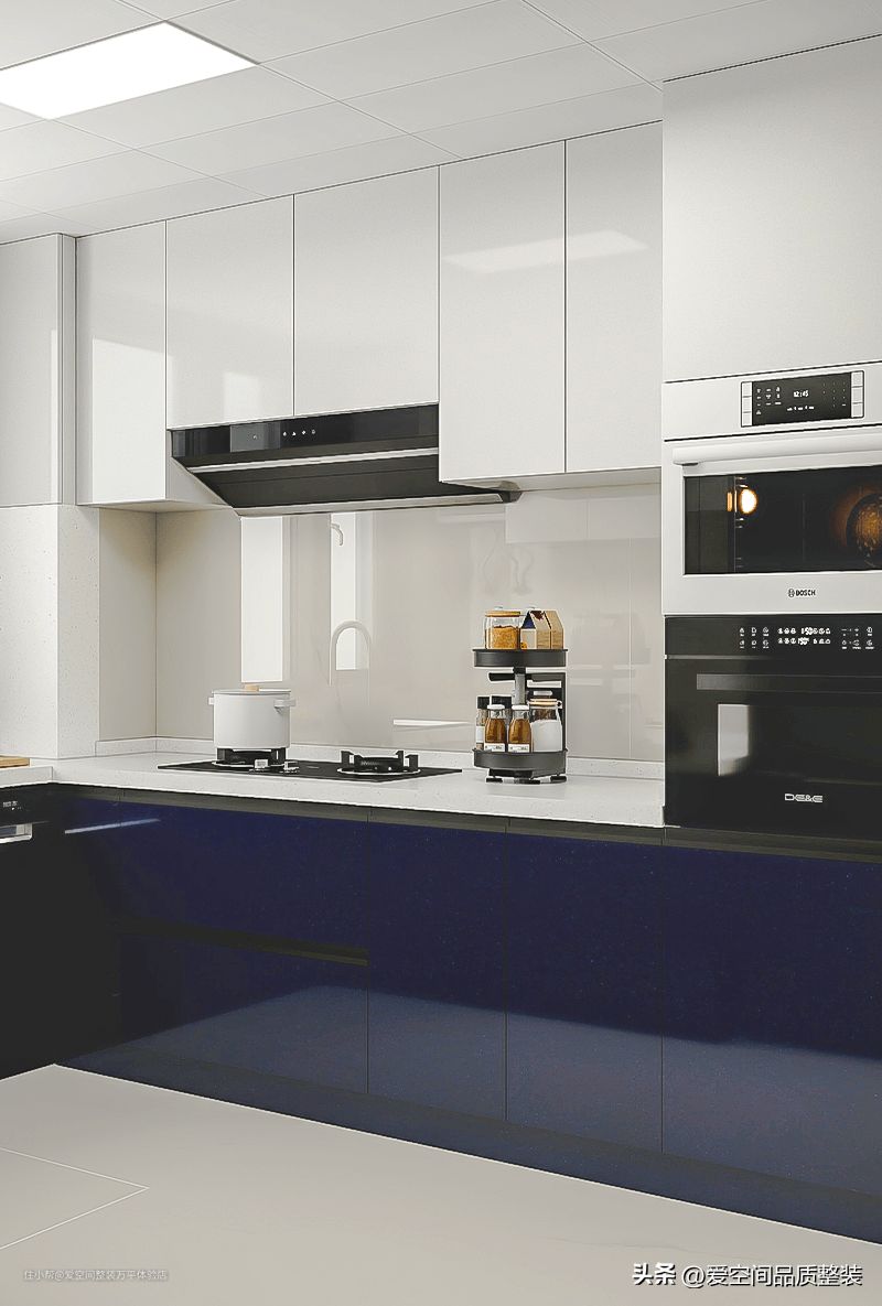 厨房的收纳主要靠吊柜和地柜,亮白色加墨蓝色,低调中透着贵气。洗菜池位于窗户边上,采光和通风都更合理。对于厨房来说,不容易滋生细菌。