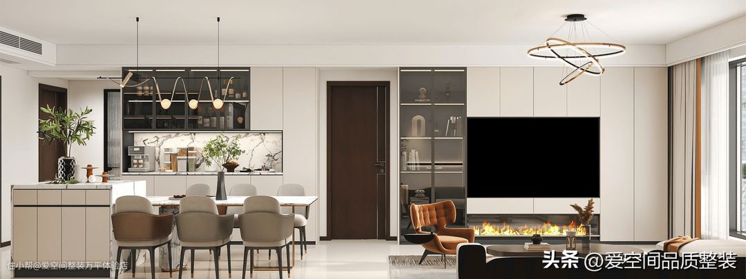 1、如果家有大横厅,那长餐桌加岛台的设计能满足多人就餐,收纳量也够,如果能在边上留出通顶餐边柜,更是不用担心收纳问题。