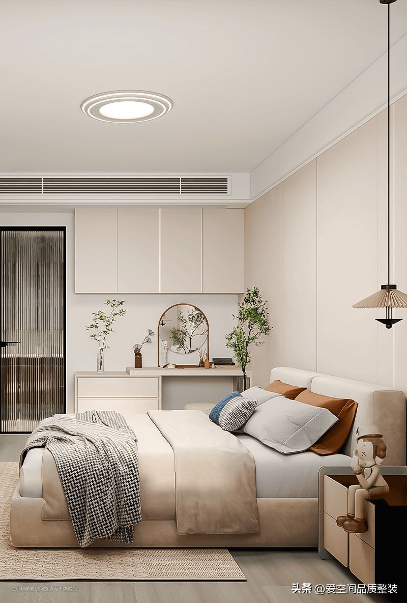 金灰色的柜体和墙壁与客餐厅一致,双人床搭配了棕色和灰色抱枕,床头柜有直线吊灯,替代了台灯,腾出了床头柜表面空间。摆放女业主喜欢的卡通玩偶,同色款也不突兀,还增添可爱氛围。不得不说,这家业主是懂疼女人的。