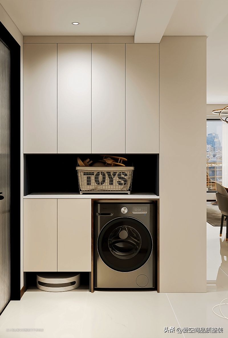 另一面的定制柜为家务区,全家的杂物都在这里。安装了插座,放下了洗衣机。柜子下方留出了20厘米的空间,收纳扫地机器人很方便。金灰色的柜体,高级又大方,同色封边更整齐,视觉上看全镜面的柜门也更干净利落,还便于清洁。