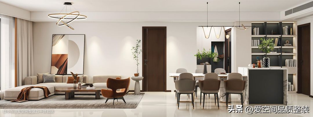 超大横厅视野非常开阔,靠近窗户的一边为客厅,大沙发+贵妃位是大户型可以选择的款式。另外,在茶几一侧摆放棕色休闲椅,客厅成半包围的交流区域,满足业主家聚会的需求。而餐厅也是采用了长桌加岛台的设计,容纳量大,多人可就餐。