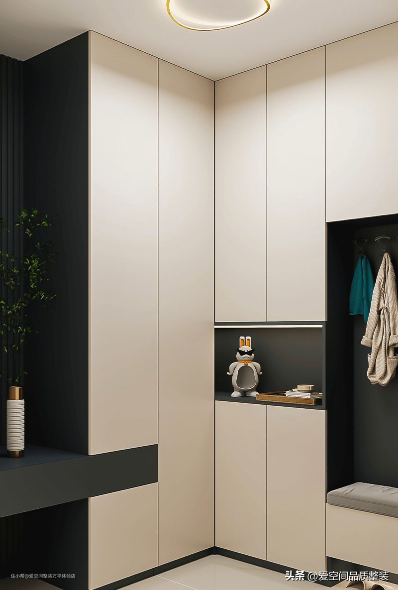 玄关处的转角定制通顶收纳柜,充分利用入户的墙壁,将所有鞋靴容纳。另外,做了挂衣区换鞋凳,让进出门穿戴衣物更加方便。中间的柜体也做了开放格,加装灯带,温馨又便利。