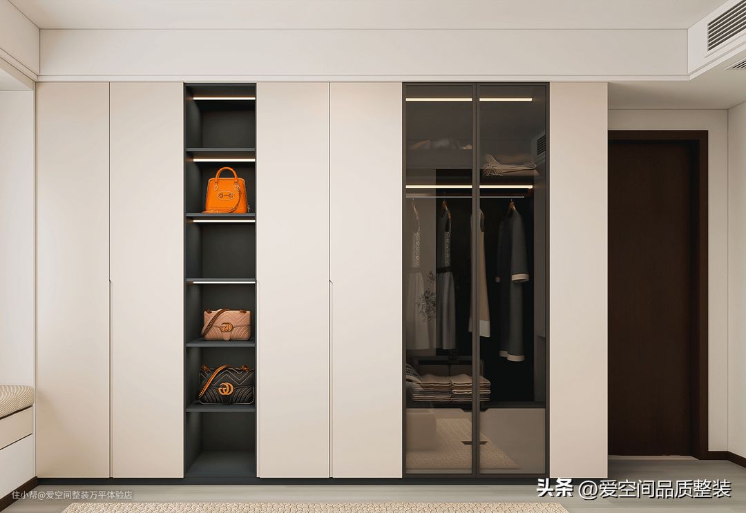 主卧的一面墙全部打造了通顶衣柜,规划了挂衣区和叠衣区。另外开放了一部分格子,放置一些高级包包,加装灯带,瞬间就有衣帽间的样子。