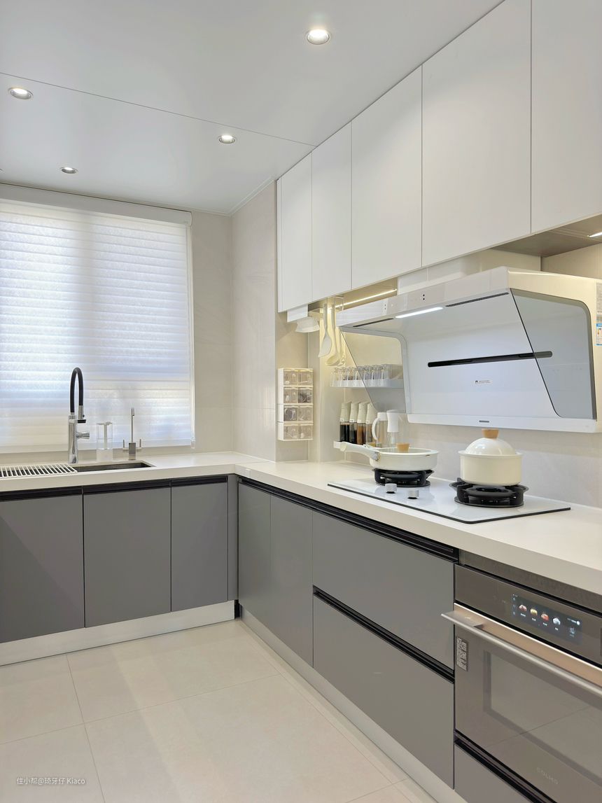 厨房属于工作区,对明亮程度有很高的需求。所以大面积的照明依靠筒灯,而吊柜下方背光区,可以在橱柜里侧1/3处增加灯带,再也不怕身子遮光看不清了。