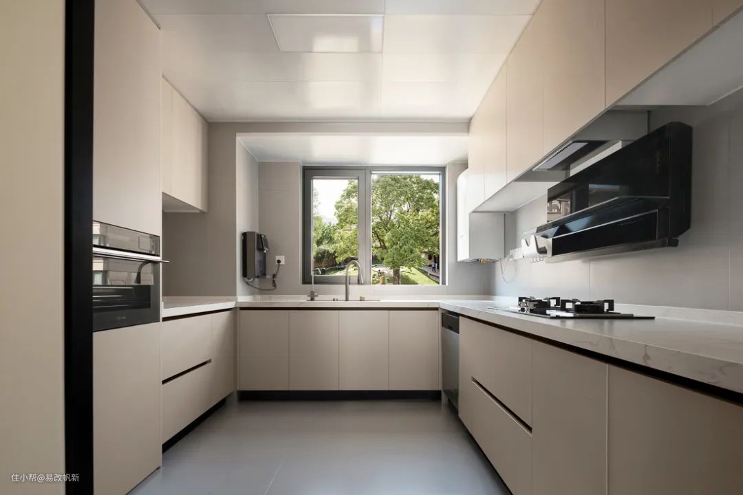 U型厨房实用性强,操作区域动线合理,整体视觉上整洁清爽。操作台面上利用转角位置做延伸,里侧的“L”型用于操作台面,侧面则充分定制柜体收纳。延伸出嵌入式烤箱及双开门冰箱位置,可视化的足量收纳达成~
