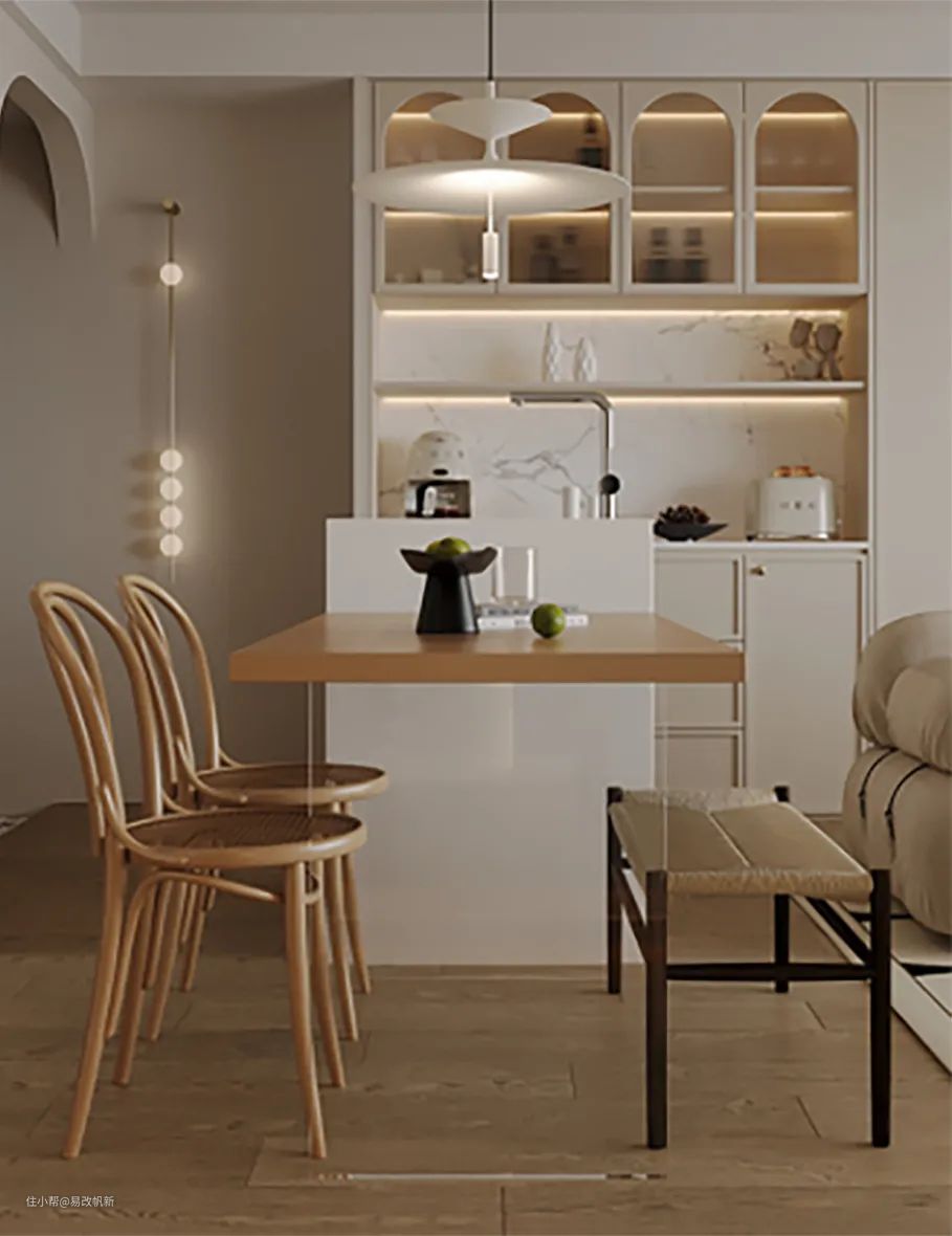 餐边柜采用拱形柜门搭配长虹玻璃,经典的法式搭配,温柔又高级。