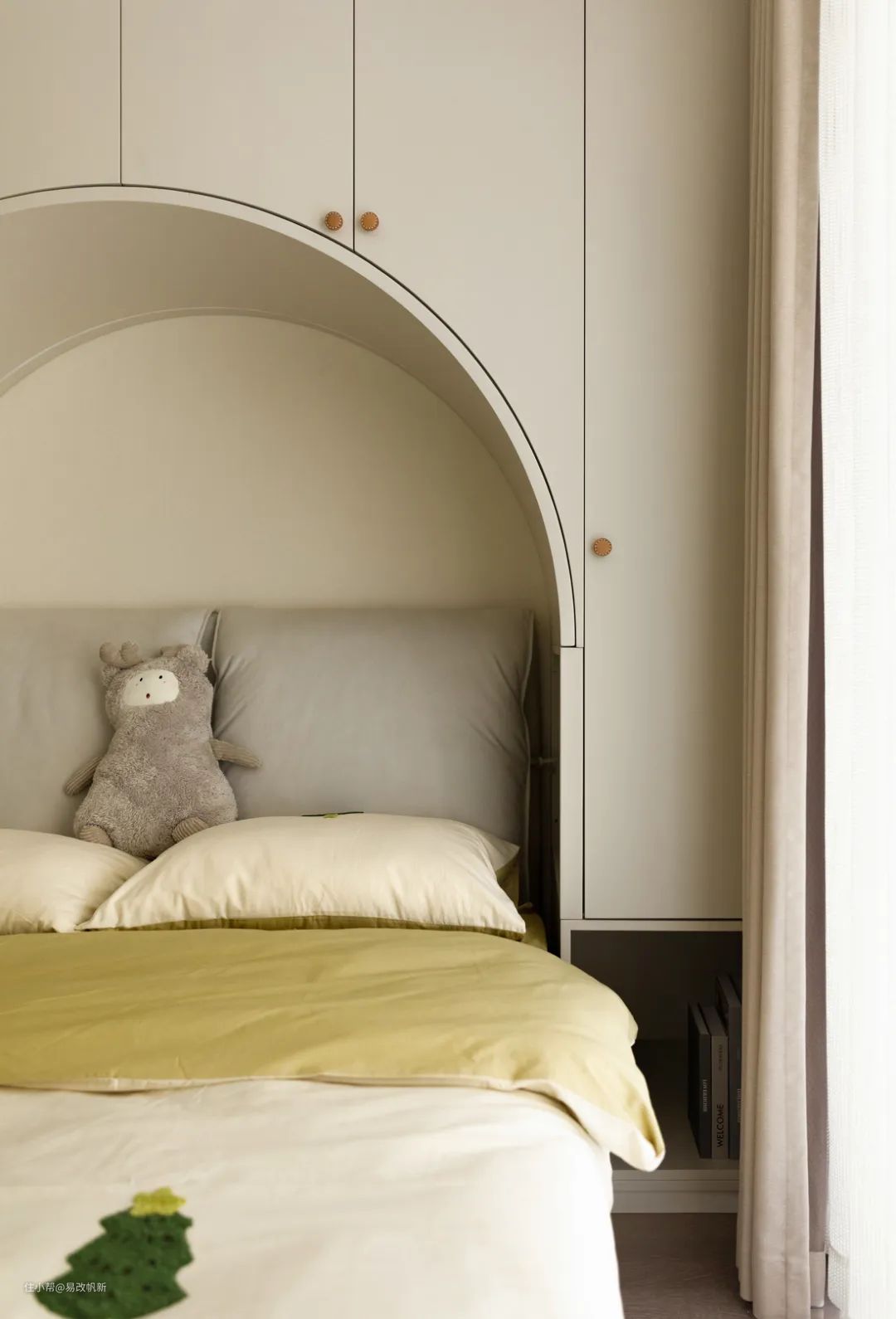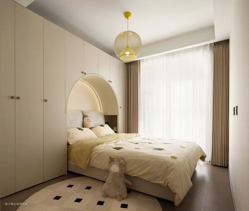 对于儿童房,我们是希望融入更多的童趣和孩童的烂漫,所以颜色是我们是以米色、浅淡的鹅黄色为主调,整个空间的色彩就比较天真烂漫。在造型上,我们是做了一整面的衣柜,中间做了一个内凹式的拱形成为床头背景,既有了这个房间独属的趣味性,又有了超强的收纳空间。