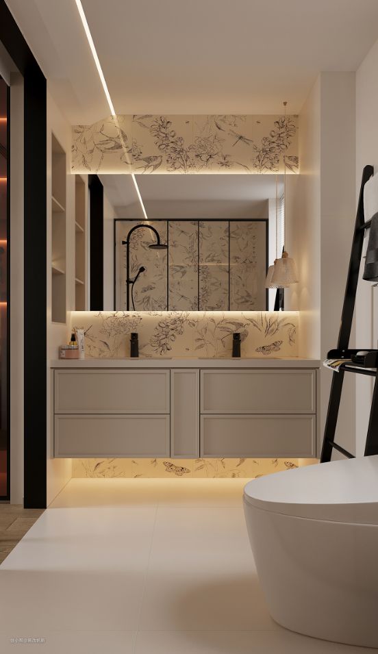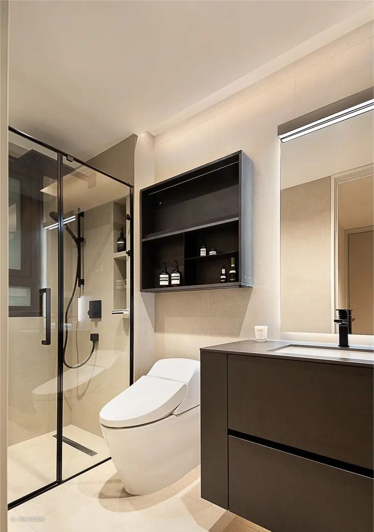 卫生间重新规划,扩大了面积,功能也变得强大;洗漱区的双人设计,悬空的梳妆镜,满足双人同时洗漱的需求。线性灯带烘托氛围和局部照明,瞬间拉高了卫生间的格调,提升整体质感。