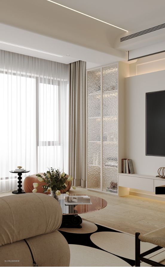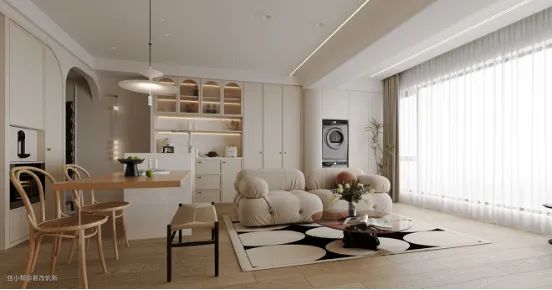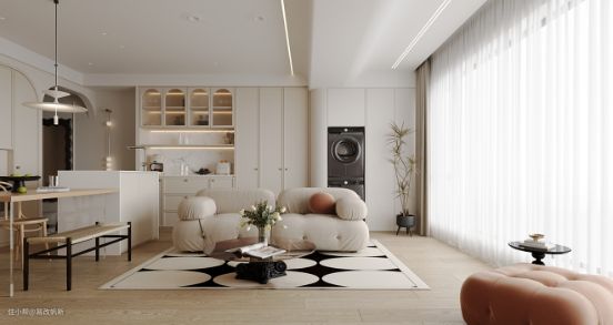 奶油色系赋予客厅最初的温柔感,让归来的家人能一秒卸下疲累。模块沙发可以根据个人喜好随意组合,在空间的任意角落感受温馨的气氛。