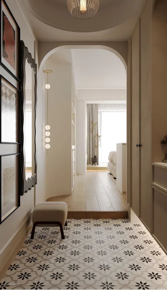 入户玄关处做了一组柜子,不仅可以收纳鞋子,开放格可以放置随手小物,对面设置了换鞋凳和换衣镜。复古花砖和拱门造型,自然划分区域,实现无尘入户,方便清洁。