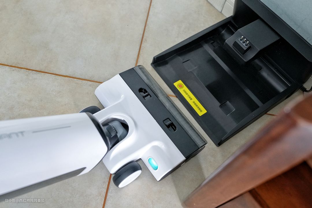 小米的这款吸洗拖一体机相较于另外几款机器有个明显的特征就是自带一个有水箱的基站。不过基站并不是用来辅助自清洁的,而是用来给洗地机补水的。