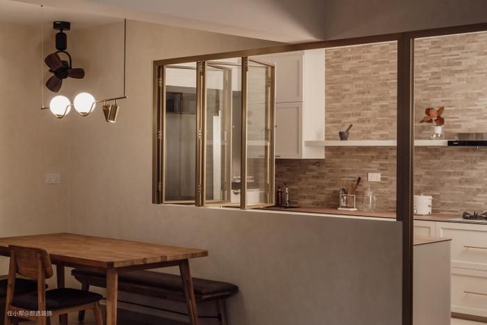 如果你仔细观察,你会发现用餐区的设计也划分了厨房空间,白色的一半是干厨房,橙色的一面是湿厨房!