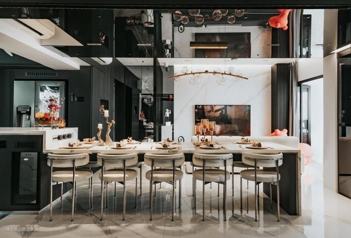 为了确保公共区域有足够的空间容纳 3 张桌子/岛台,这个类似 VIP 套房的房屋的房主将客厅改造成酒吧和用餐区,客人可以站在岛上聊天,聚集在桌子旁观看足球比赛,或等待饮料上桌。