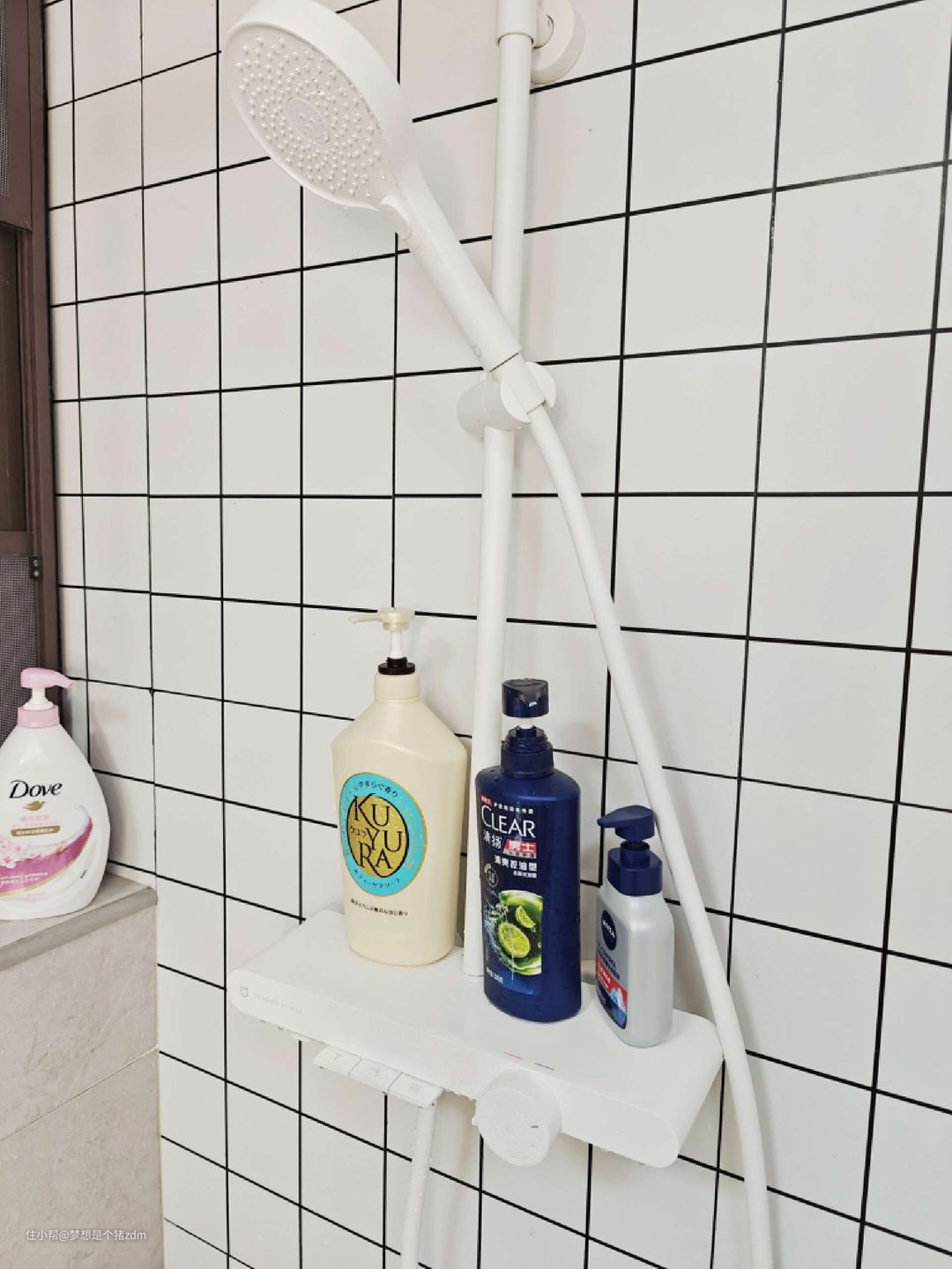 这种琴键式控制的淋浴花洒还有一个我非常喜欢的地方,那就是拥有一个大尺寸的置物台,像我家主卧这个卫生间里装的是淋浴房,整体空间比较有限,所以就没有安装额外的置物架,平时一些淋浴用品就只能全放在窗台上,现在换成米家控温花洒N1之后,就可以将其中一些淋浴用品放在这个置物台上了,拿取非常方便。