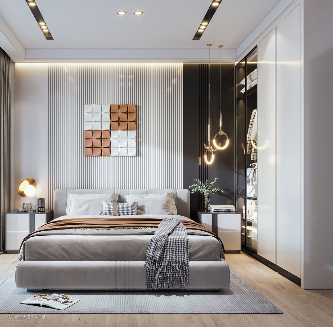 8. 灯的布置:如果选择床头台灯,可以直接放在床头柜上。如果选择吊灯,建议将吊灯安装在床尾10厘米外的地方。