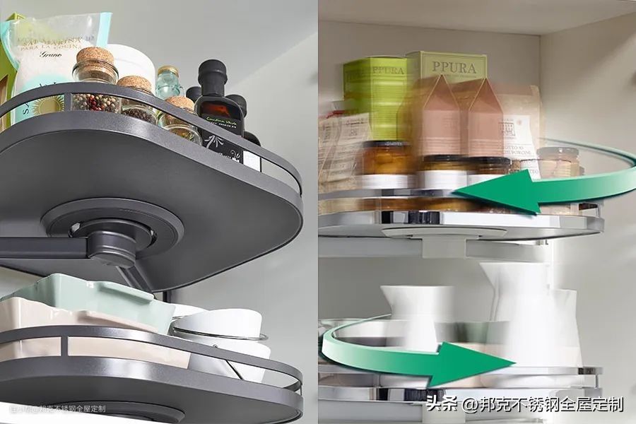 所以对于收纳储物的能力要求十分高。像邦克推出的高迪厨柜,在收纳功能五金上,配置灵动旋转篮 ,分类摆放,深处物品可直接转到外层,轻松拿取,充分利用电器高柜内无法触及的空间;托盘转到特定角度,会自动锁定,防止拿取物品托盘转动,而产生的安全问题,极大地提高居住者的使用效率与安全性。