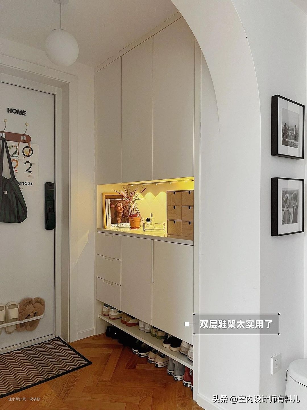 案例一:这位屋主的玄关柜是半嵌入在墙壁内,节约了2平方空间,柜体是木工打的,除了常规的收纳以外,鞋柜底部做了双层鞋架,刚穿过的鞋子不想立马放进柜子里,就放在下面一格,上一格放家居穿的鞋子,很方便,很整齐。