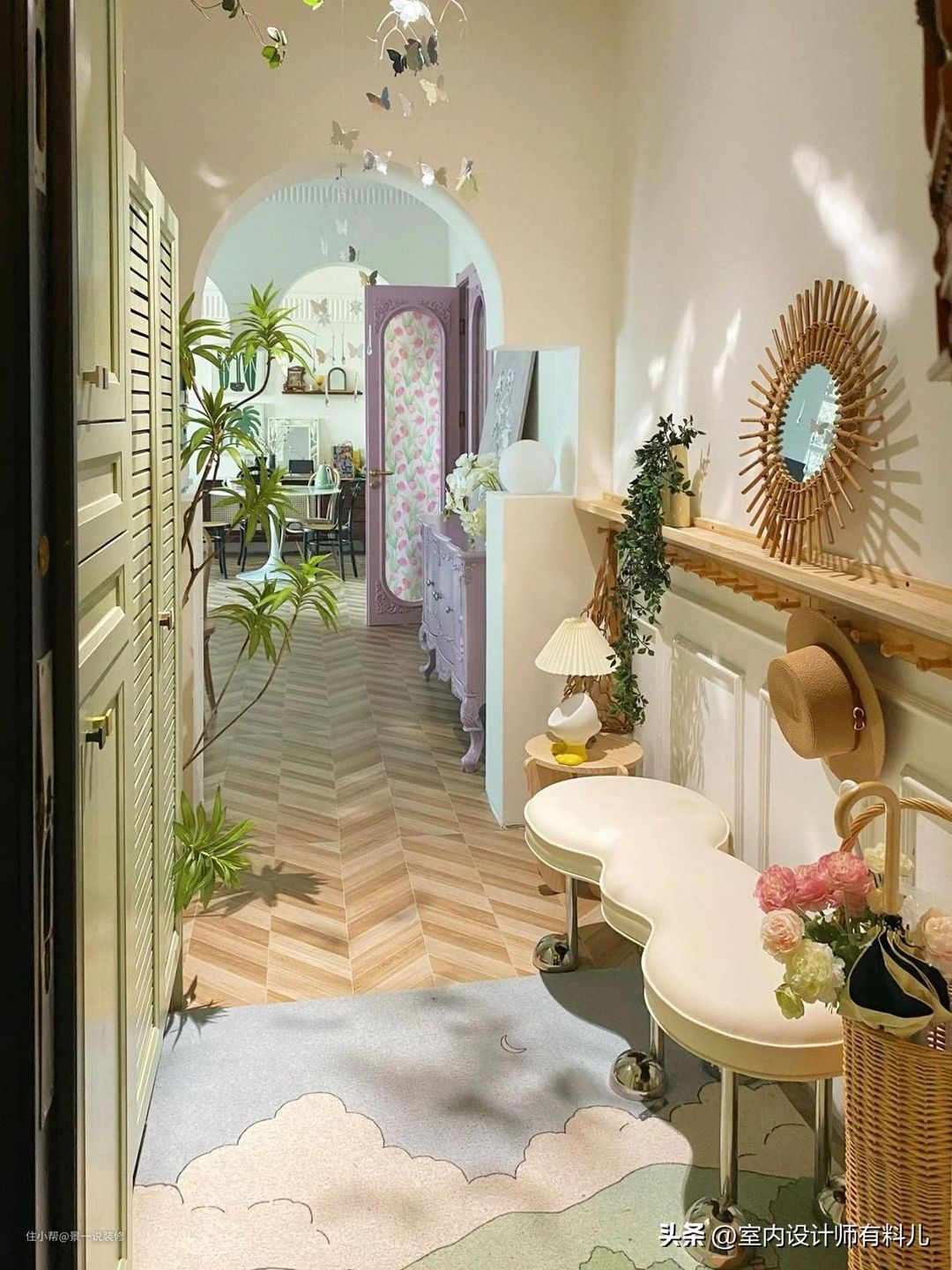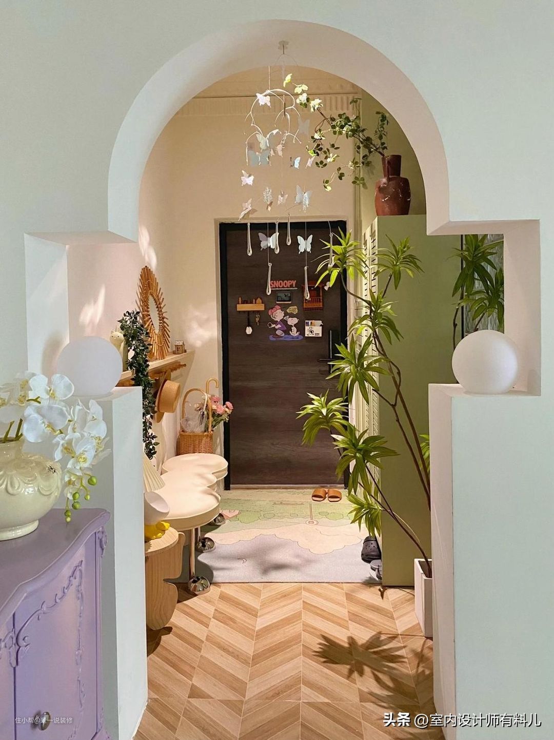 玄关与客厅之间设计了一个弧形门洞,将玄关独立出来,然后装饰了一些很可爱的摆件、绿植、灯饰,将回家的仪式感拉足了,每天一回家心情就很好。