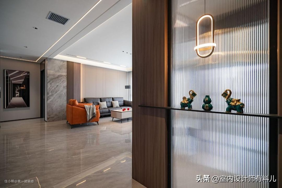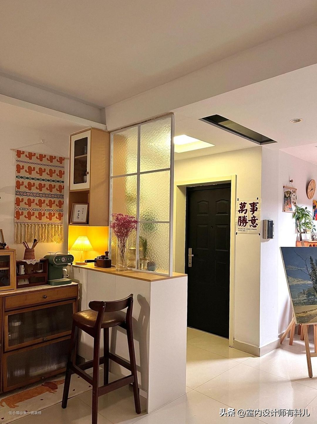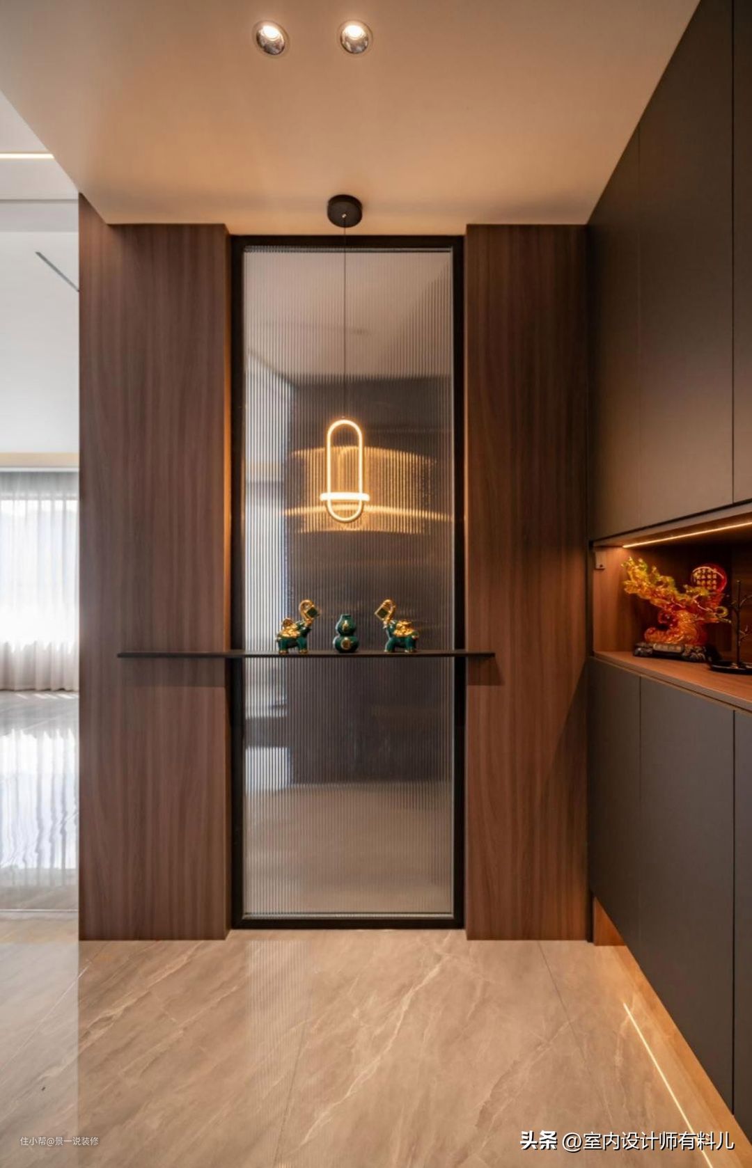 于是右手边做成鞋柜,正对面则做成长虹玻璃的隔断,朦朦胧胧的美,保留了透光性,又保护了隐私,加上灯光的渲染,成了进入家中的第一道风景。