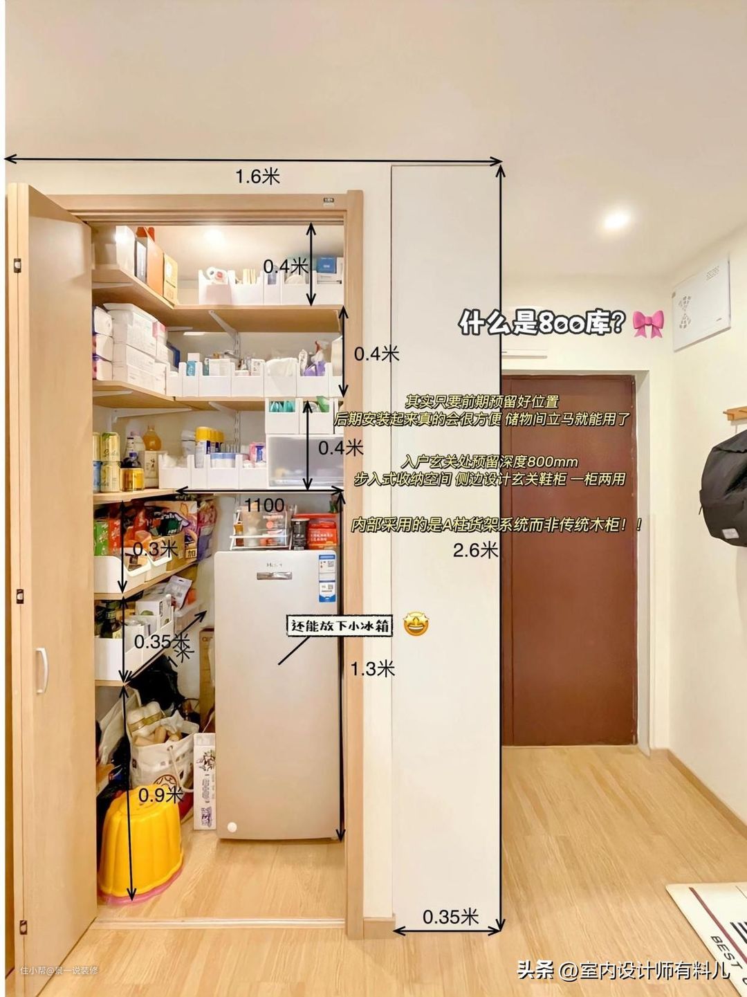 这个800库等于有了鞋柜,杂物柜,次净衣区,里面可以不用做背板,用货架或金属配件组合收纳,什么乱七八糟的东西都可以收在里面,设计成无底柜,行李箱、小推车也能直接推进推出。