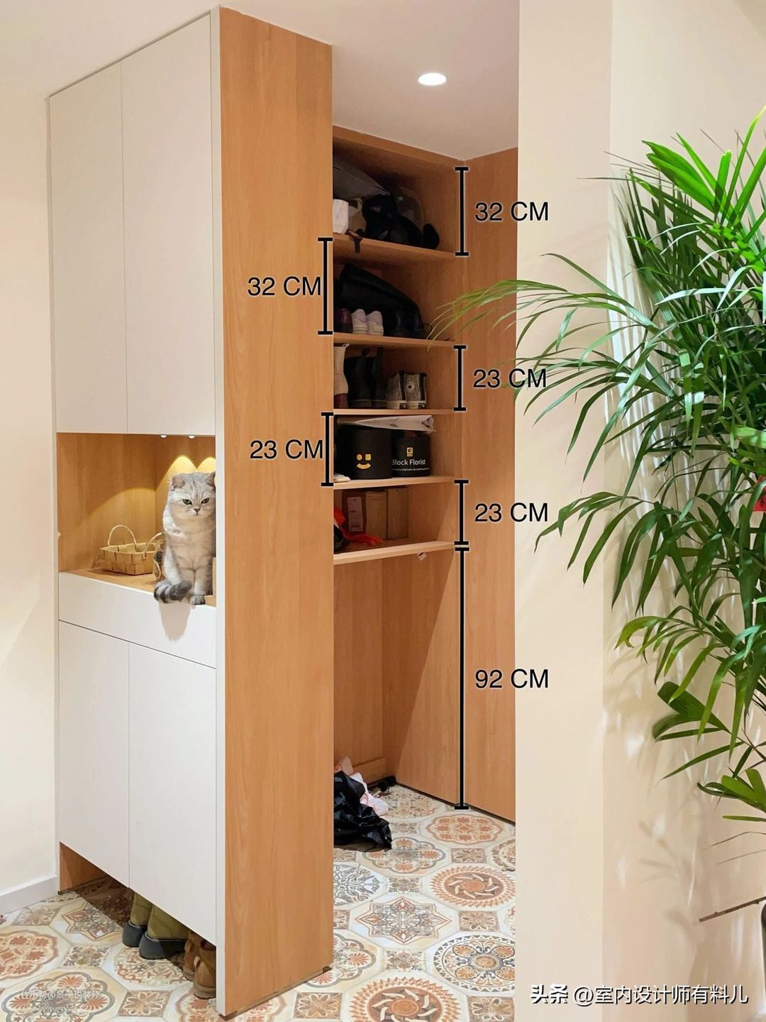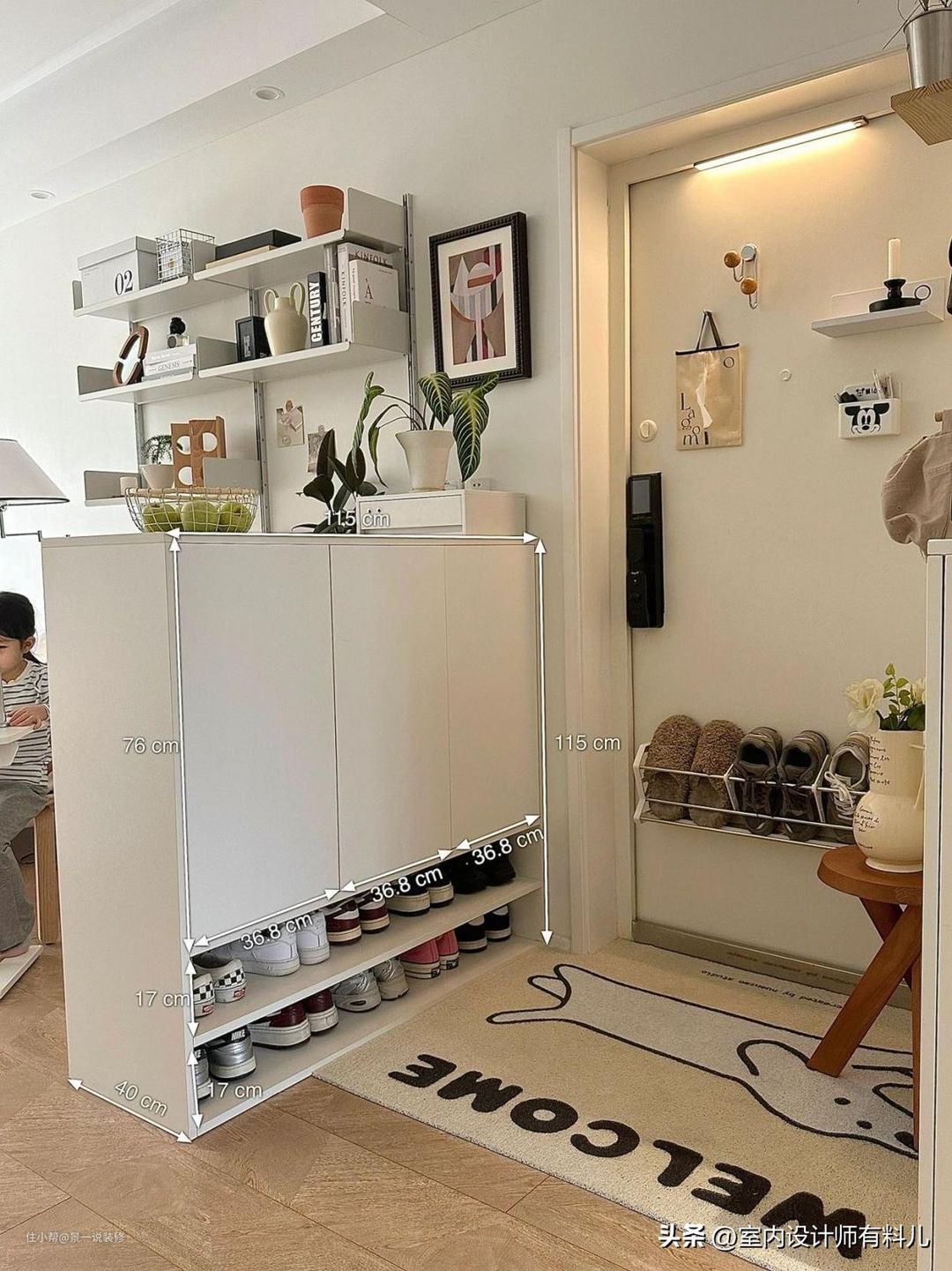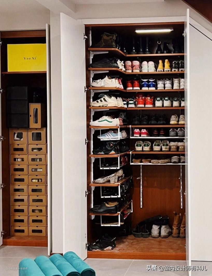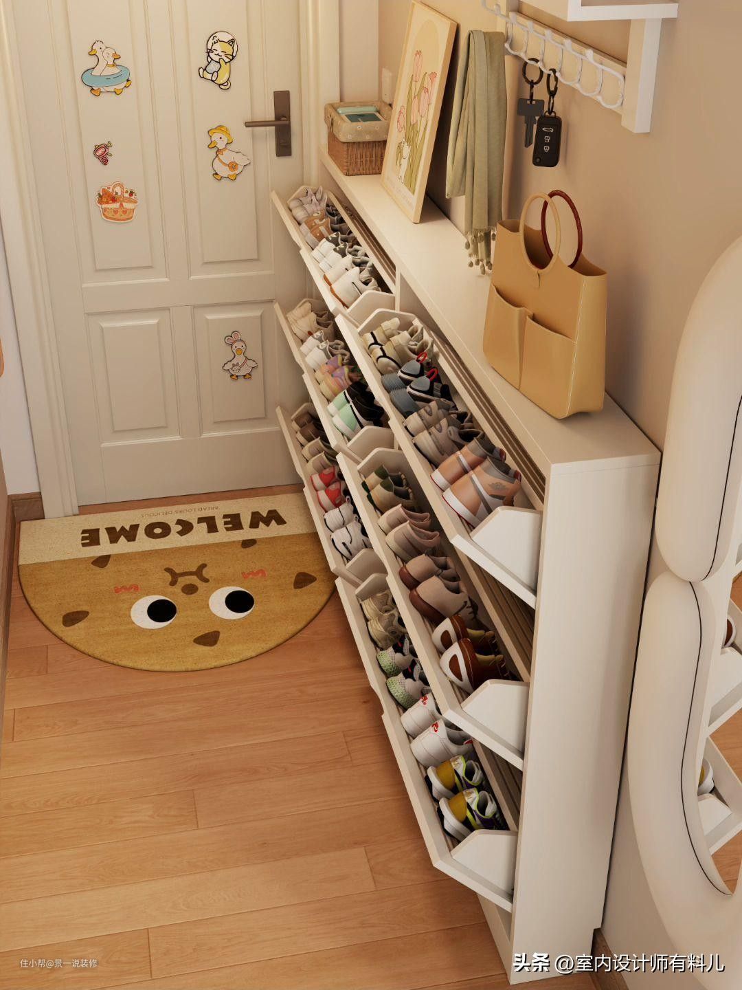 因为当初装修的时候觉得定制鞋柜价格偏高,所以做了很多功课,设计了一个800库鞋柜,不用费心打理,真是实用。