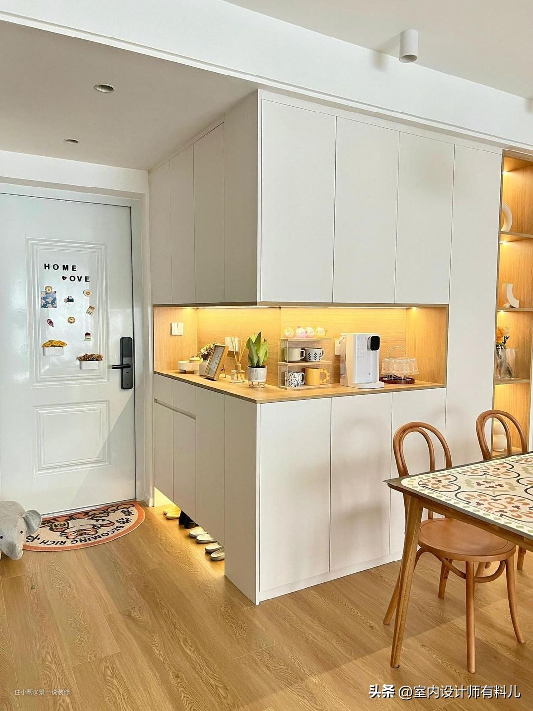 案例三:进门左手边是L型墙体,利用墙体的转角,设计了一体式的鞋柜和餐边柜,颜值、收纳兼具。