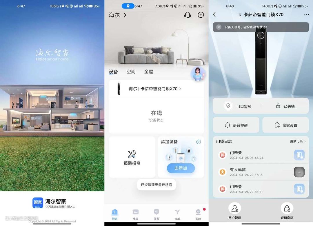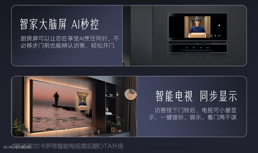 3)卡萨帝智能门锁X70接入了海尔全屋智慧系统,可以识别开锁对象并联动其他智能家电、家居启动预设的智能家居场景;有人按门铃时,会同步显示到手机电视等设备,用户可以自由选择接听,生活更便捷高效。