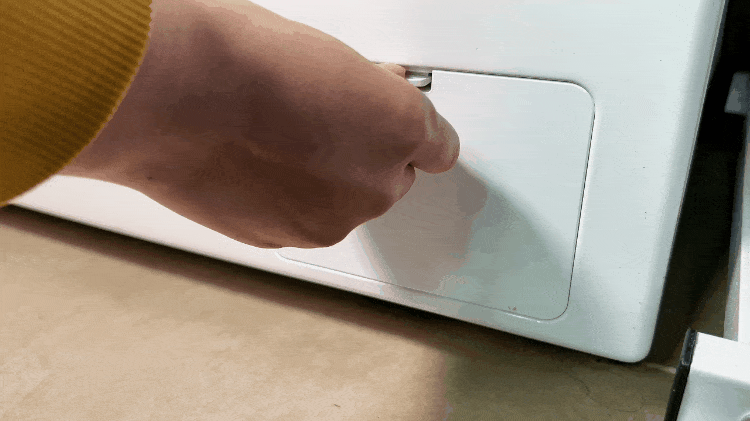 这东西一般是蓝色或者红色的,按下它的顶端,就能把洗涤剂盒拉出来。看看洗涤剂盒背面吧,肯定已经变得一片狼藉了!