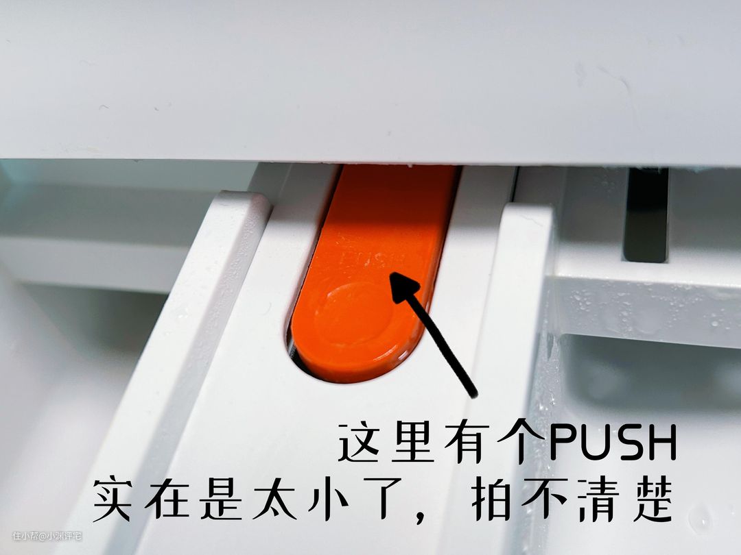 第二个是洗涤剂盒,前面也说了,洗涤剂盒里面分成三个格子。其中中间那个格子是最小的,在这个格子的最后面,有一个印着“PUSH”的东西▽