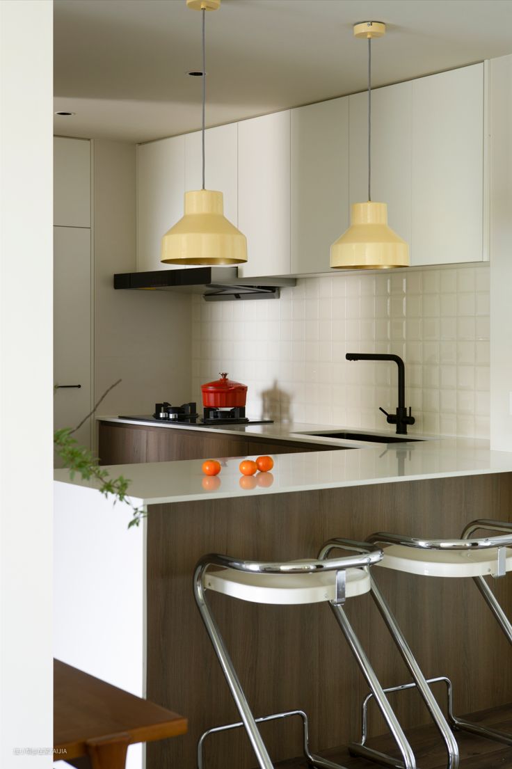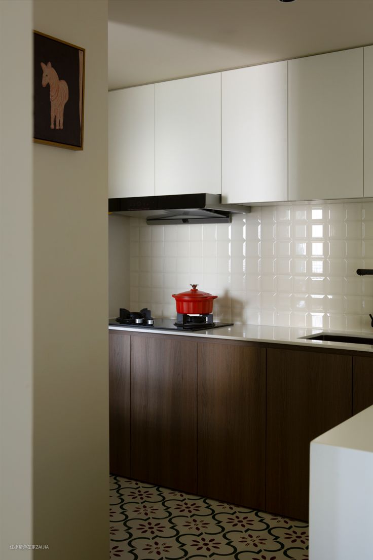 橱柜是胡桃木和白色门板的拼色设计,地面搭配好看又不显脏的小花砖,把屋主夫妻分别喜欢的日式极简和复古元素巧妙结合。