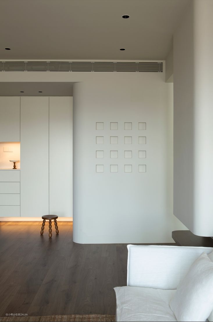 整个公共空间,设计师用一体化的思维,重新构建墙、地、物的关系,用不同材质让整个空间层次分明、久看不厌。