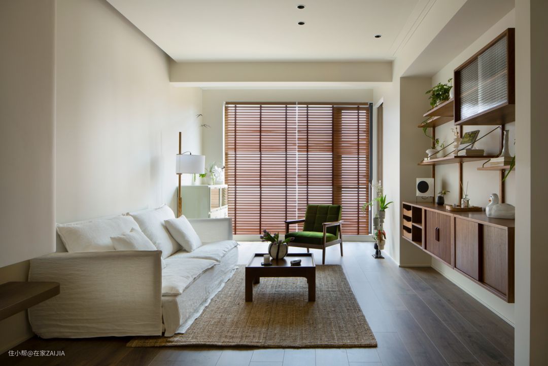 落地窗大面积使用木百叶,是窗帘也是一种装饰。每天根据不同的光线和太阳高度,灵活调整叶片角度,收获恰到好处的光影意境。