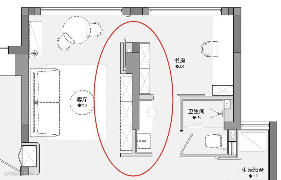 ○ 拆除墙体,做成开放式厨房,岛台同时承担操作台和餐桌的角色;