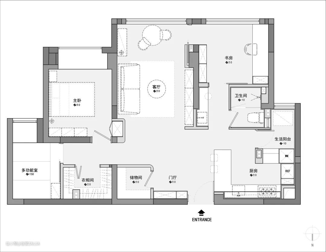 ○ 以沙发背景墙为中轴线,实现动区和静区的分离。