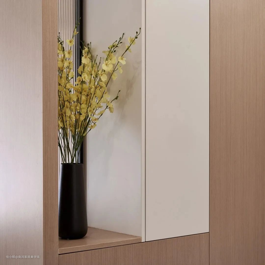 原木+奶白色实木板定制玄关柜,延长了进家动线,如音乐动人的前奏,将归家期待值和仪式感拉满~