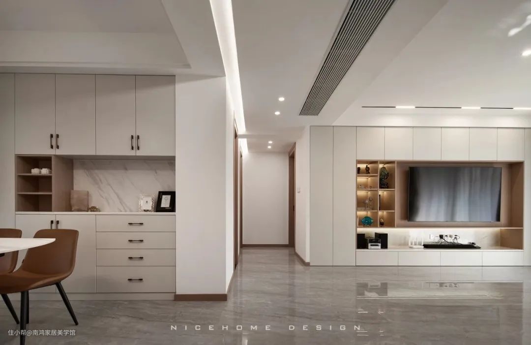 餐厅整体色调与客厅相呼应,强化了客餐区互动性,也让联动式空间更显明亮通透。定制内嵌式餐边柜,便利收纳的同时还能充当临时操作台。