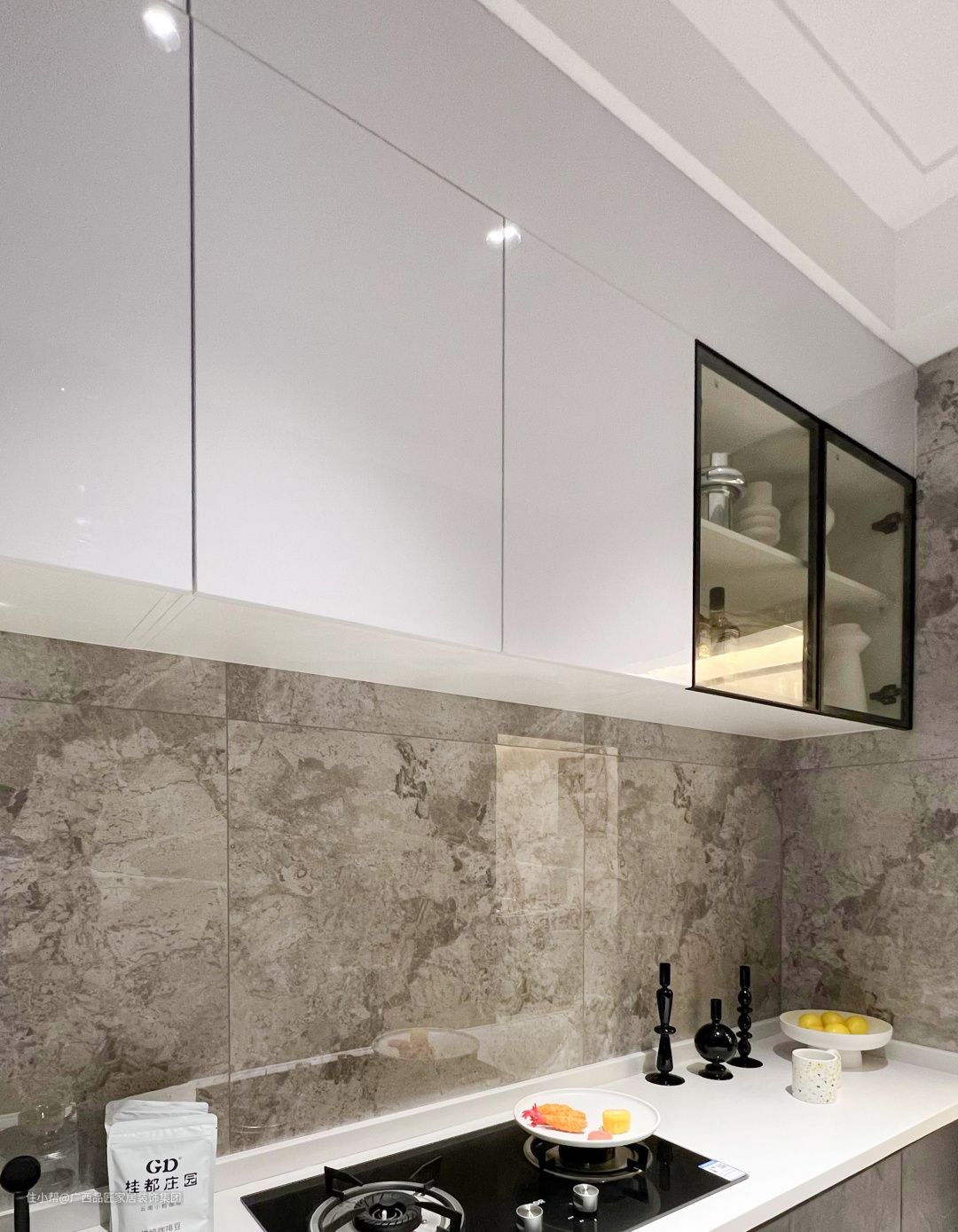 厨房上方同样安装了柜子,奶白色的色调与大理石台面相辅相成,给厨房营造一种清冷感,无把手设计更能节省空间,同时起到防磕碰的作用,柜子右侧柜门做成透明玻璃状,起到一个展示的作用,颜值和功能双双实现。